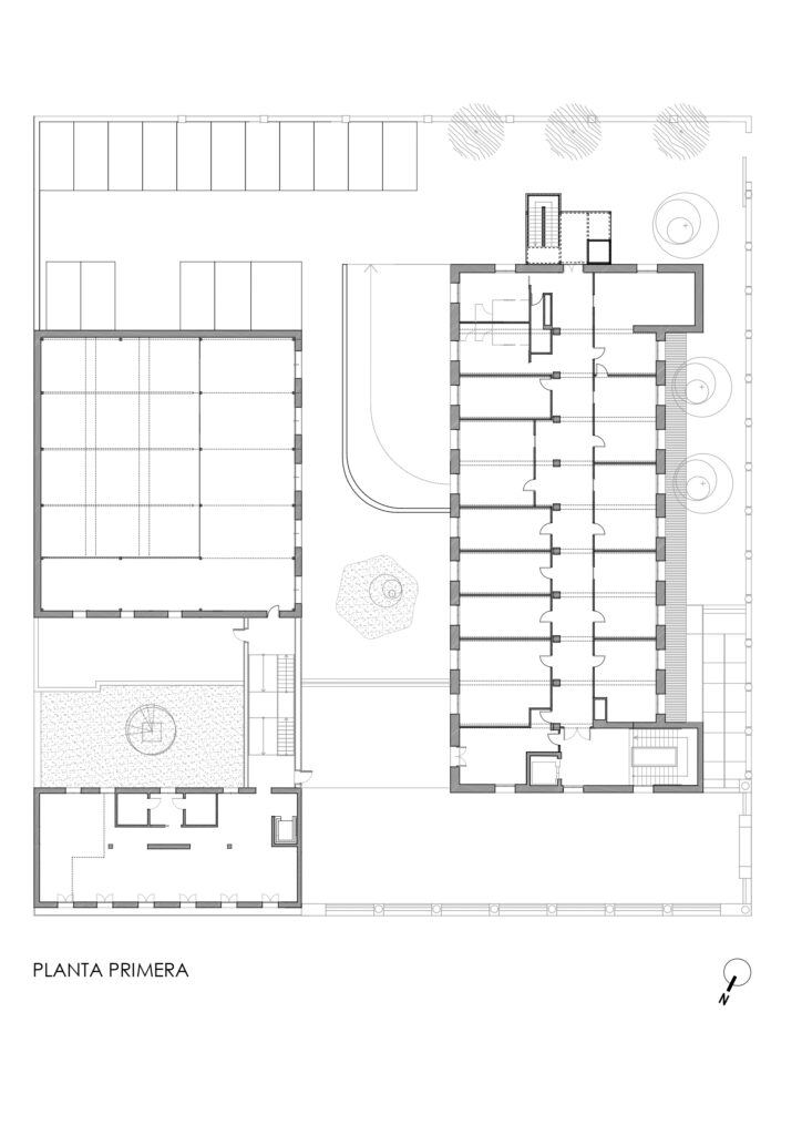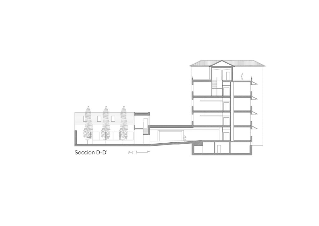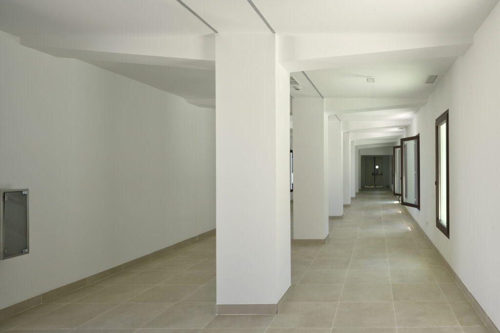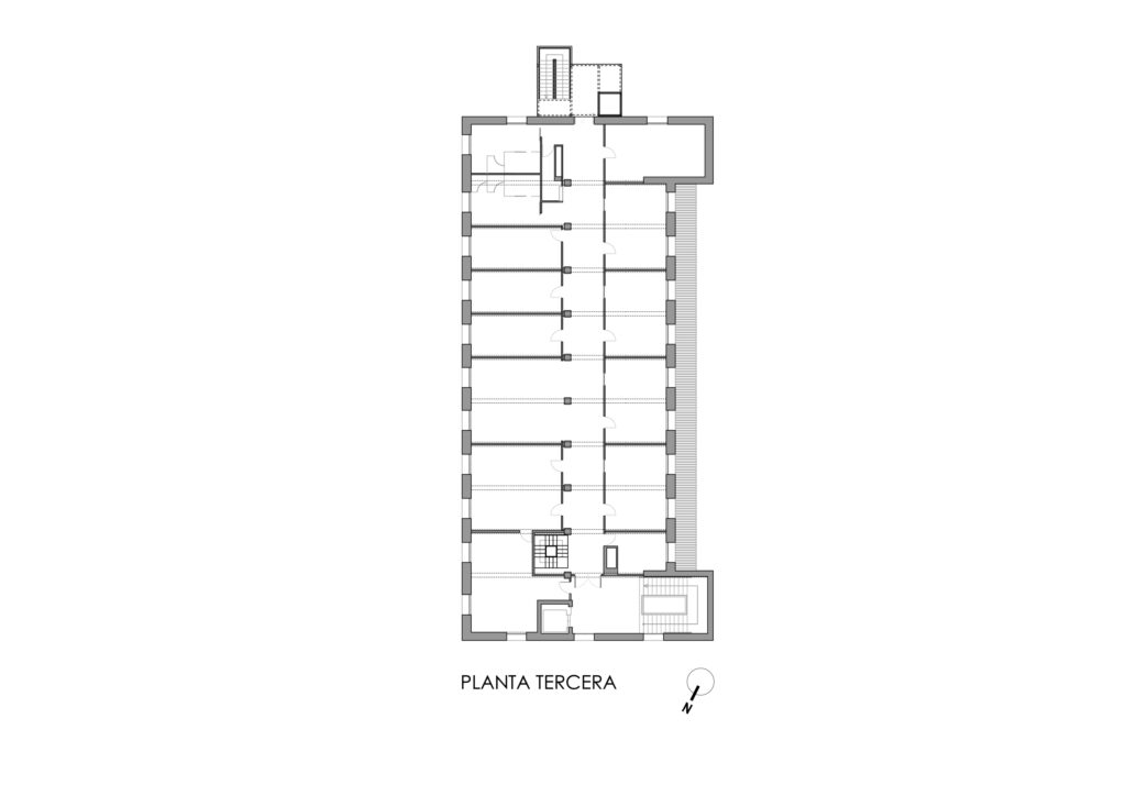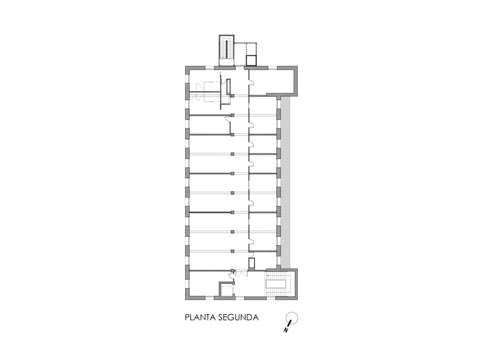 La rehabilitación se fundamenta en la lectura del edificio original como un sistema proyectado «desde la estructura». La secuencia de pórticos de hormigón armado de gran descuelgue, con luces de 3 metros y pilares centrales, constituye el ADN del edificio que en la apertura de los espacios nos disponemos a preservar.