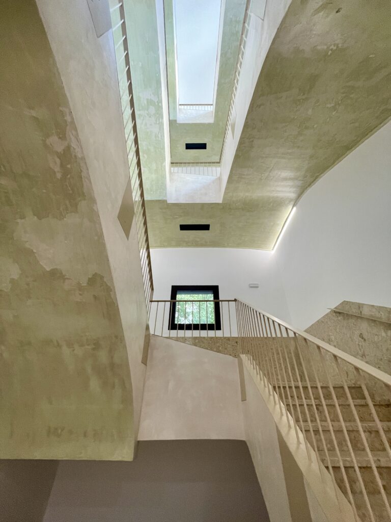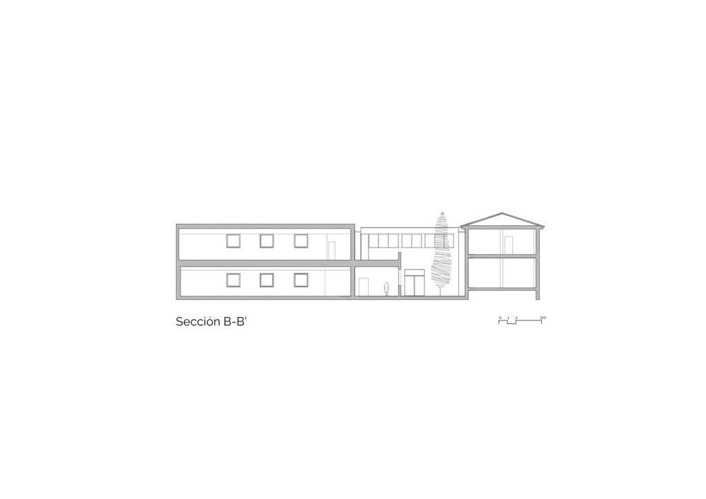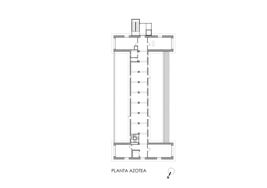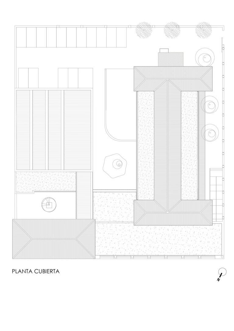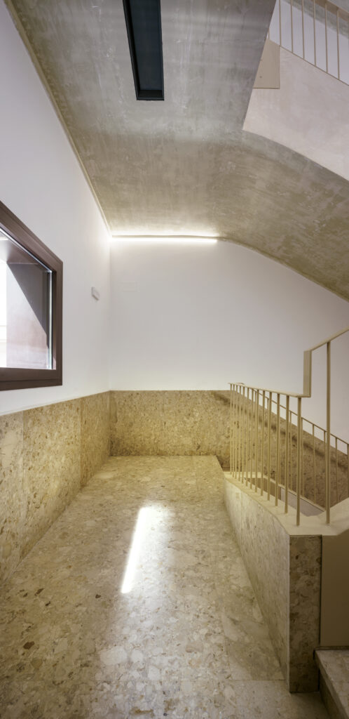 Desnudamos interiormente las coberturas del esqueleto estructural, eliminando los antiguos muros técnicos de ladrillo que ocultaban los pilares centrales. Al hacer visibles las vigas de descuelgue y los pilares desde el semisótano hasta las vigas en ménsula del ático, se recupera una calidad espacial diáfana. El antiguo sistema de «empalomado» sobre forjado se sustituye por un suelo técnico, permitiendo una gestión flexible de las instalaciones contemporáneas sin comprometer la limpieza de los planos horizontales.