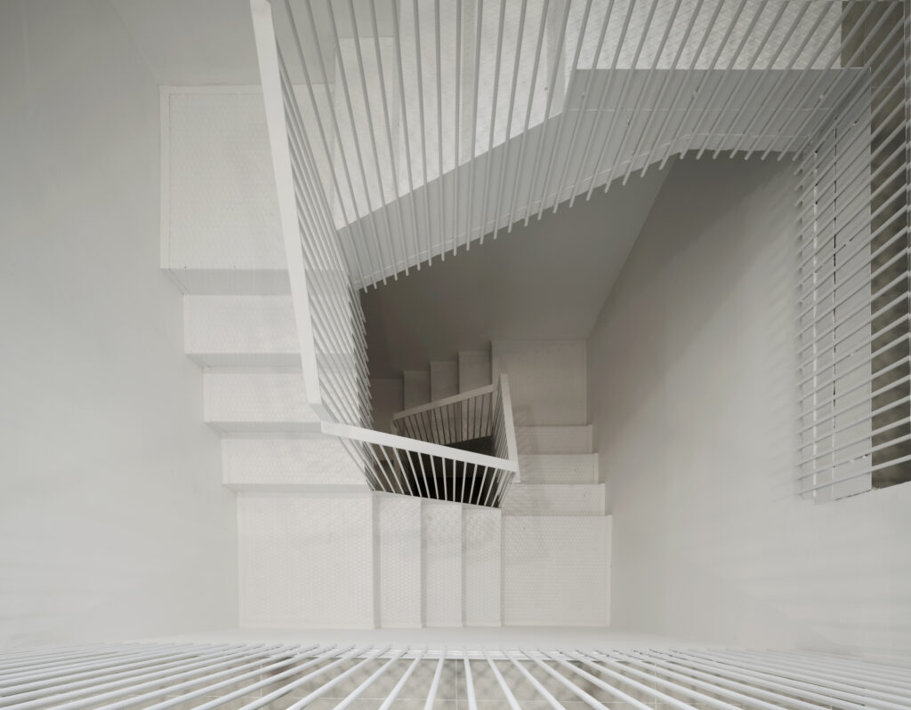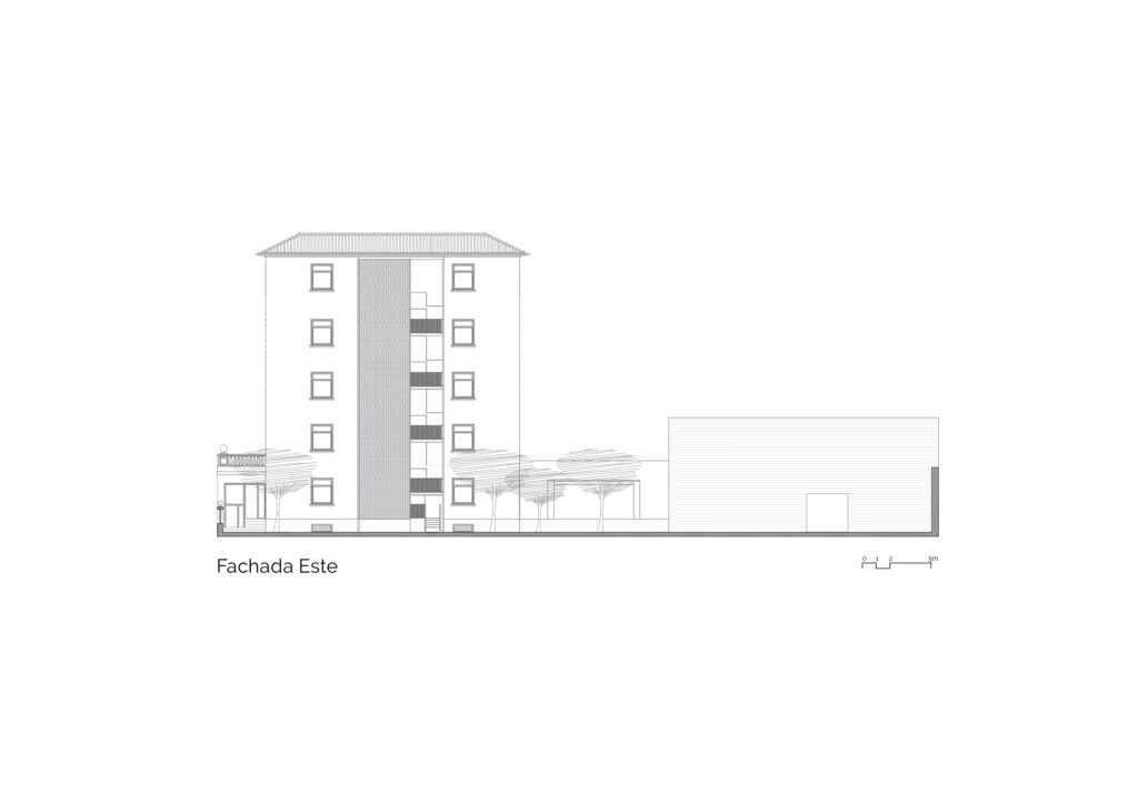 • Edificios E2, E3 y E4: Piezas de menor escala que completan el perímetro y definen la esquina urbana. El E2 actúa como rótula de acceso, el E3 formaliza la fachada lateral y el E4 se sitúa en el interior de la parcela, manteniendo su carácter de volumen exento a doble altura.