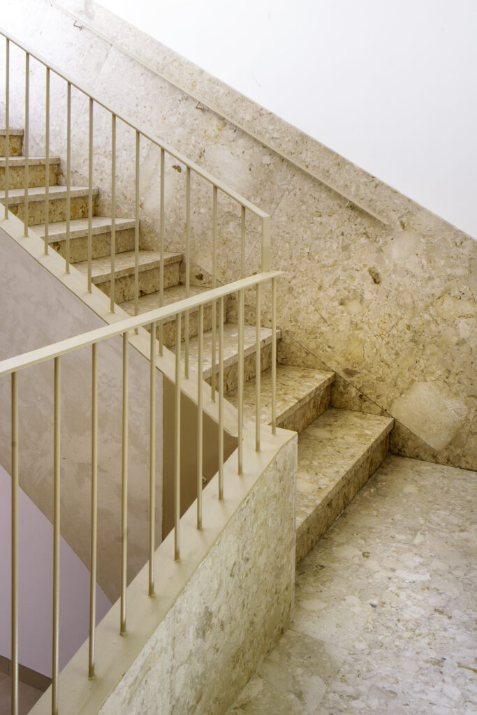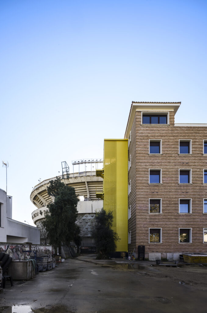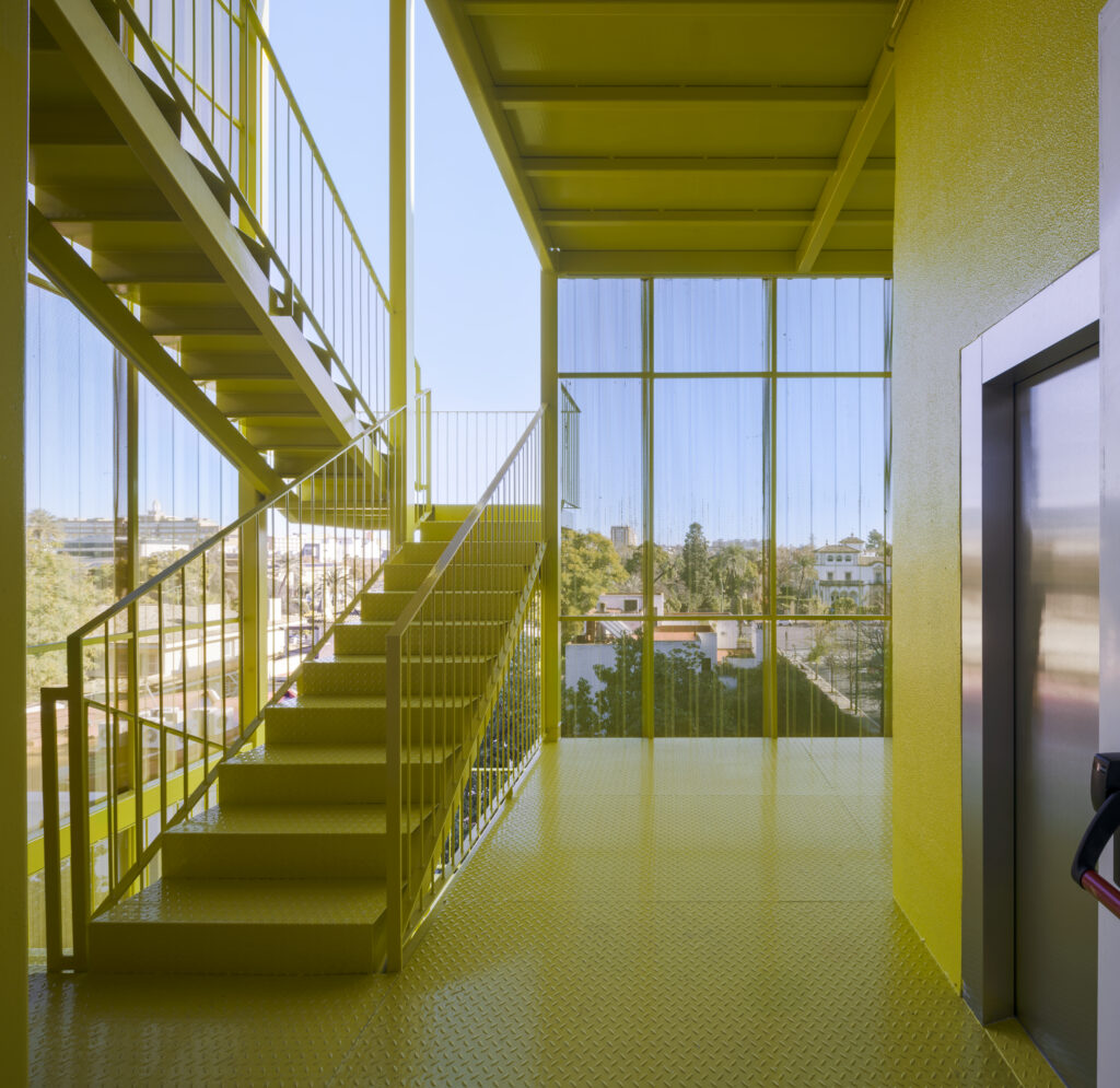 El nuevo núcleo de comunicación vertical que refuerza la seguridad en caso de incendios, introduce en la formal y rígida masividad del ladrillo el cromatismo de la seguridad vial contribuyendo a aportarle ligereza.