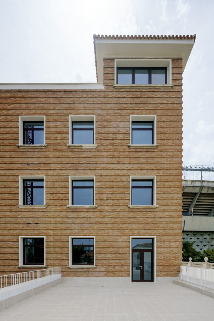 • Edificio Principal (E1): De geometría rectangular con dos alas extremas que conforman una planta en «I», se retranquea de la alineación para presidir la avenida Padre García Tejero. Su fachada se enriquece mediante voladizos por planta y una métrica de huecos rítmica y vertical.